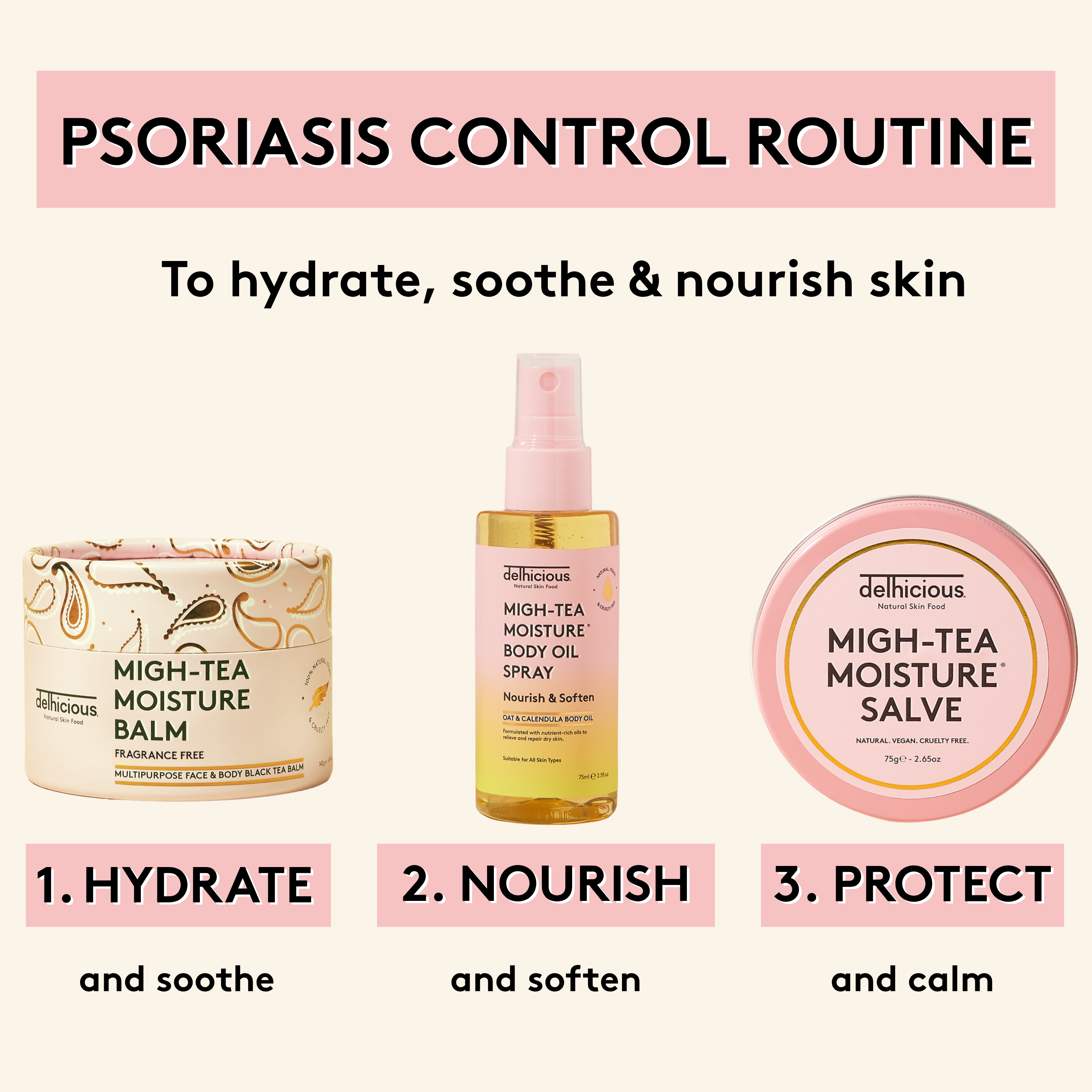 Support your skin through dryness, flaking and discomfort with the Psoriasis Rescue Kit - a targeted 3-step body care routine designed to deeply nourish, soothe and protect compromised skin.